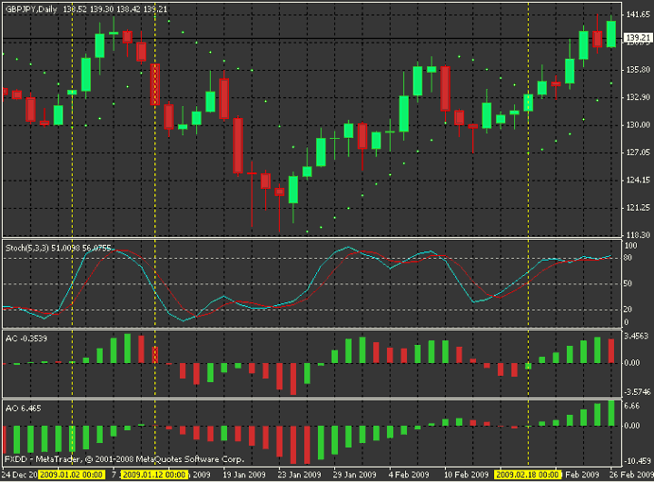 Hi Ash, thanks for system.  Is there a misprint in the pdf file?  In the entry instructions shouldn't the 80 say 20 and vice versa?  Because just being below the 80 does not make a pair oversold, but being below 20 does? Hopefully some screen shots will be posted eventually (I dont know how to do that). Also, would we rather exit when the AC changes color? The posted trades would have done better. Thanks Michael ENTRY Sell: When the first PSAR dot appears above the candle, AND stochastic is crossing down but is not oversold (i.e. not below the 80 line), AND the AC is red, AND the AO is red, AND candle is red (bearish candle). Only enter once the candle has fully closed. Buy: When the first PSAR dot appears below the candle, AND stochastic is crossing up but is not overbought (i.e. not above the 20 line), AND the AC is green, AND the AO is green, AND candle is green (bullish candle). Only enter once the candle has fully closed Last edited by Lazarus; 09-03-2009 at 18:21. |